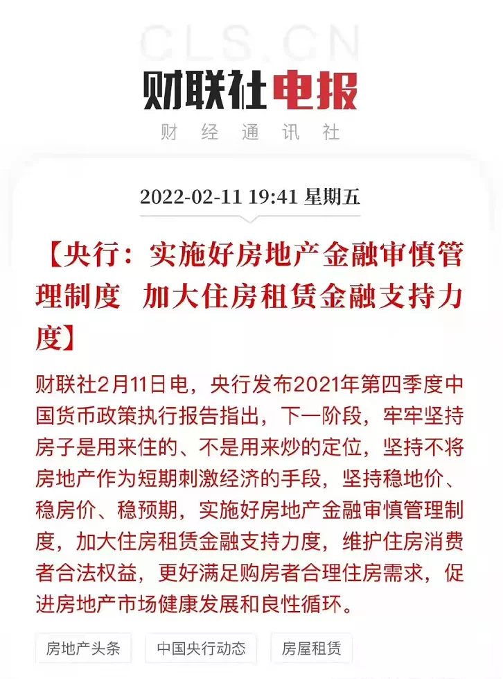 ×政策支持 加大住房租赁金融力度财联社2月11日电,央行发布2021年第四季度中国货币政策执行报告指出,牢牢坚持房子是用来住的、不是用来炒的定位,坚持不将房地产作为短期刺激经济的手段,坚持稳地价、稳房价、稳预期,实施好房地产金融审慎管理制度,加大住房租赁金融支持力度,维护住房消费者合法权益,更好满足购房者合理住房需求,促进房地产市场健康发展和良性循环。