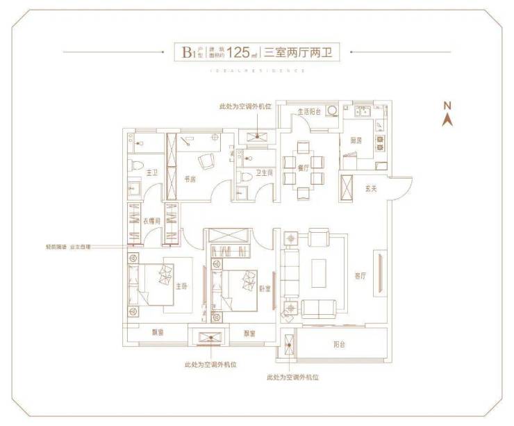 建面约125㎡舒奢三室两厅两卫户型 ,约4.8米的方正阔绰客厅,不论是亲朋好友来访于厅中畅聊,还是家人齐聚话家常,都可幸福容纳。