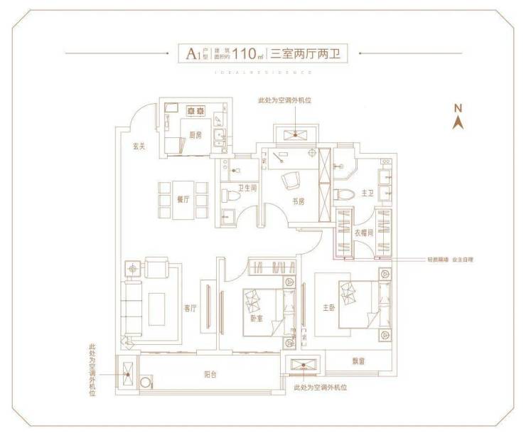 建面约110㎡经典三室两厅两卫户型,客 厅、主卧、阳光次卧三开间朝南,超大面宽,轻松满足一家人的生活所需,舒适度足够动人。