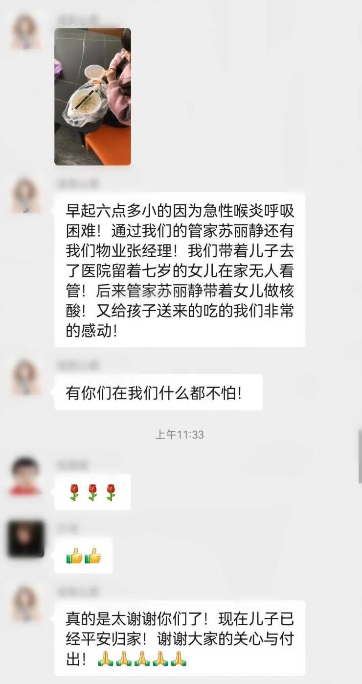 面对封控,建业物业每一个工作者,都坚守在抗疫一线,以全部力量,撑起城市复苏的曙光。建业世和府物业经理张占斌和管家苏丽静,早晨6点左右得知一业主家的小儿子因为急性喉炎呼吸困难后,主动协助业主把生病的小朋友送至医院。而后因业主家大女儿在家无人看管,管家苏丽静便主动带着小朋友做核酸,并给孩子送去食物,及时给业主反馈家中信息,让业主放心。