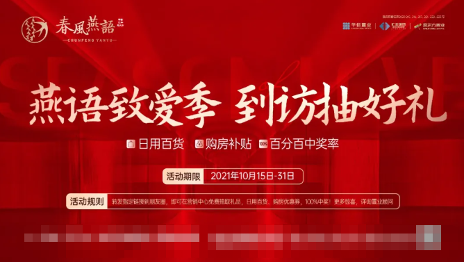 趁着时光正好,金秋送爽桂馥弥香,春风燕语开启“到访免费抽礼品”活动,到访即有机会免费抽取日用百货、购房补贴,百分之百中奖!好礼多多,等您来参与!