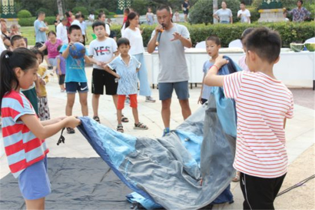 小朋友们同心协力共同搭建专属的“家”。帐篷陆续搭建完成,五颜六色的,一个挨着一个,空荡荡的地方一下子就丰满起来。远远望着,像一座座小城堡,装着属于不同家庭的天空。