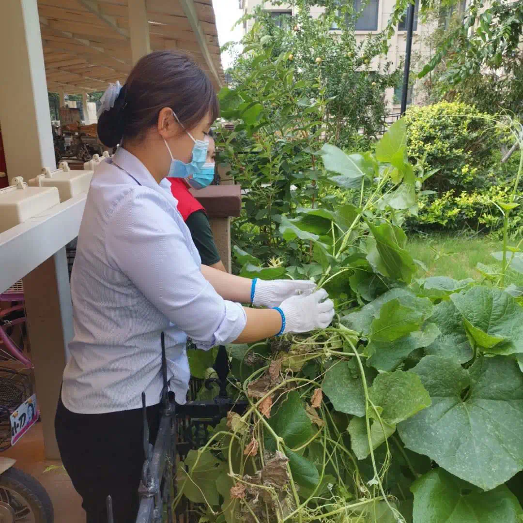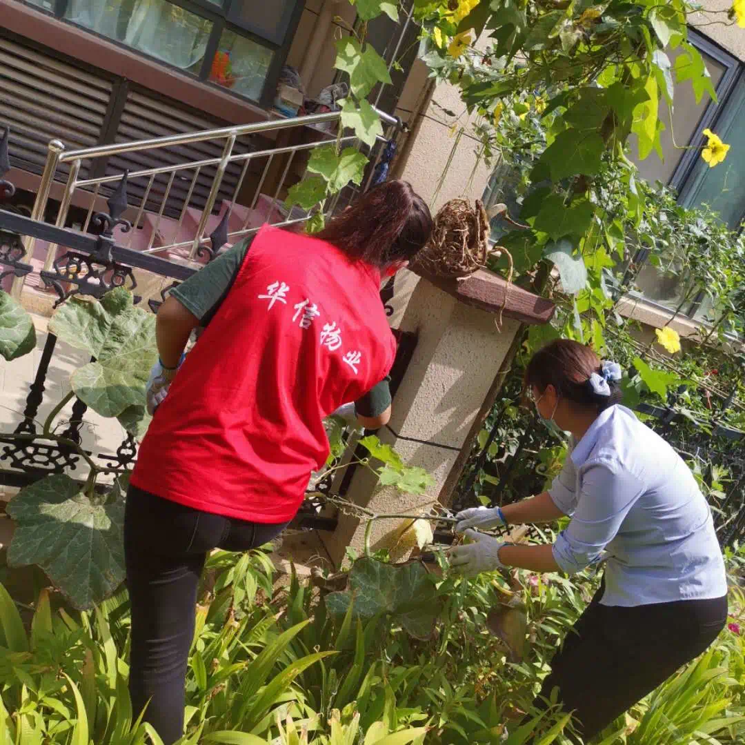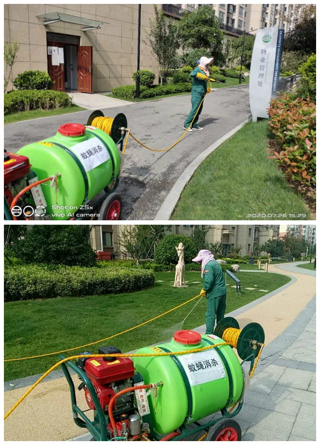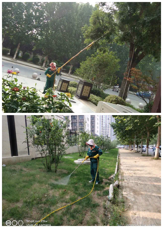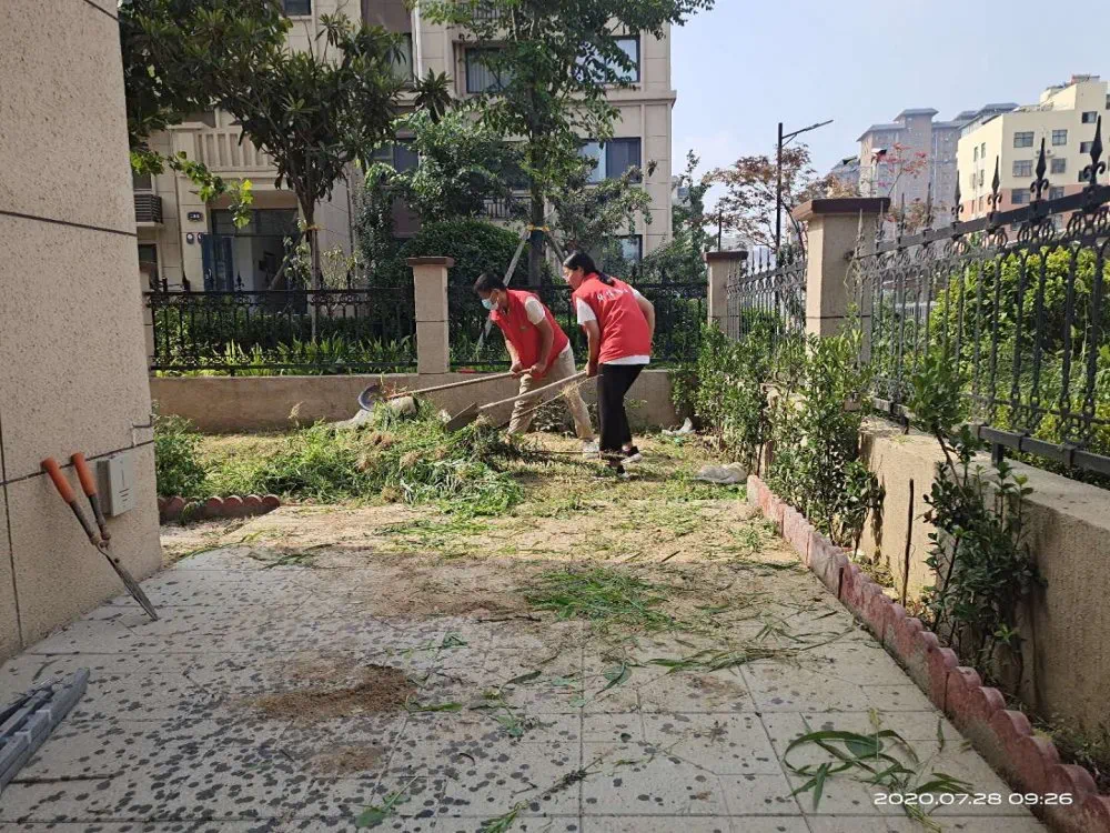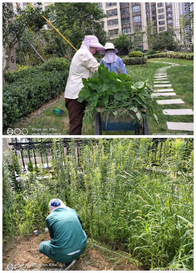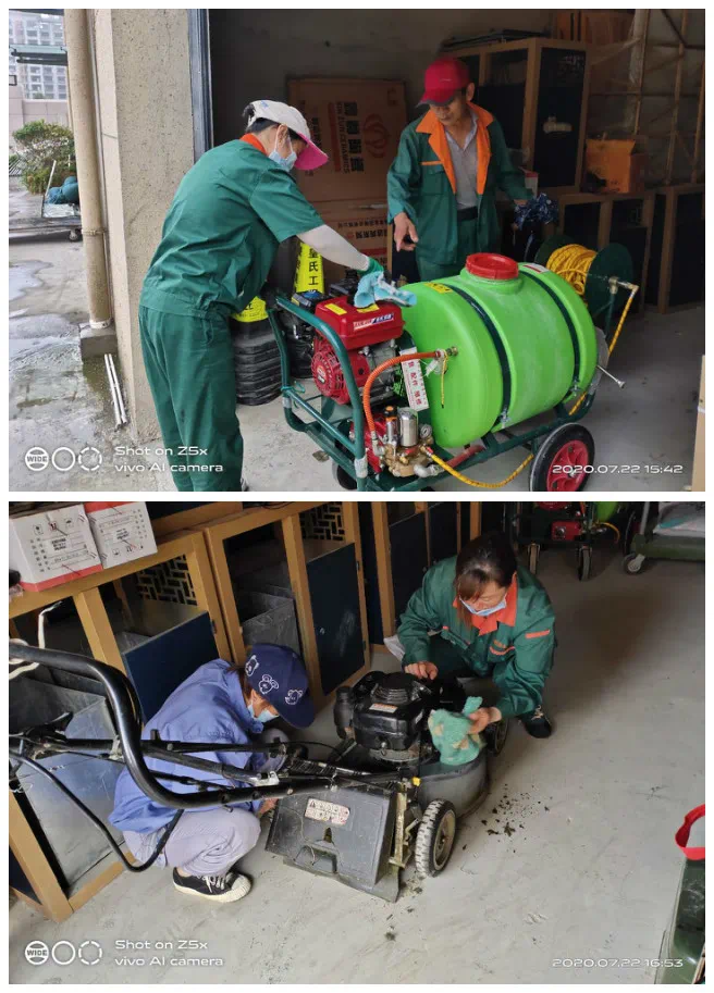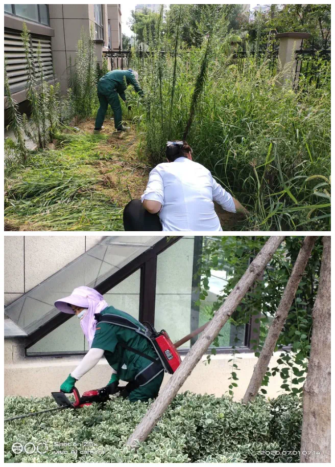 7月绿化养护:她们拿着枝剪穿梭在灌木和草坪中,将园区内外没有修剪完的绿篱修剪完工。园区内外割草各1遍(包括北门、东门),园区灌溉共2遍,雨天园区草坪施肥1次,园区绿篱拔草1遍草坪拔草2遍,园区北门东门外拔草1遍,园区打药4次(分别是樱花、国槐、绿篱各2次)园区蚊蝇消杀2次,园区草坪打药2次,绿化机器保养1次,配合管家整理业主家小院杂草清理2处。培训学习绿化养护修剪知识2次。