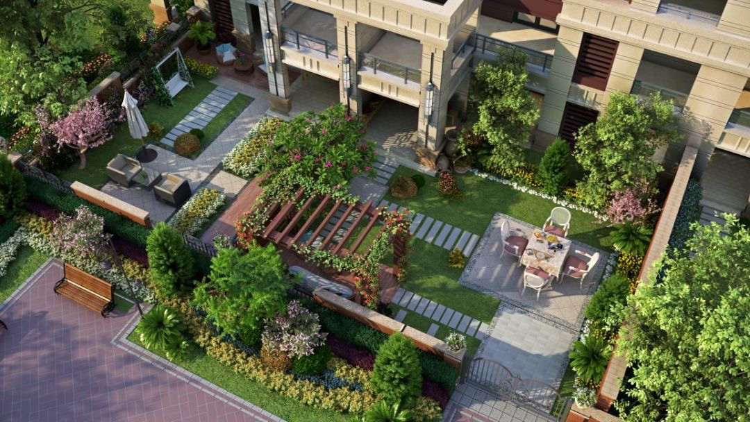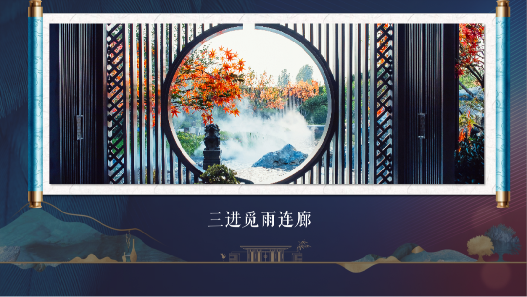 小区园林景观按照“六进”园林打造:一进府邸、二进山院、三进折廊、四进花台、五进水庭、六进桥。打破传统花草树木交错的园林设计,做到真正的皇家园林(有山有水),整个园林规划尊重自然原生,并与建筑交相呼应,相辅相成,形成一个系统的整体。