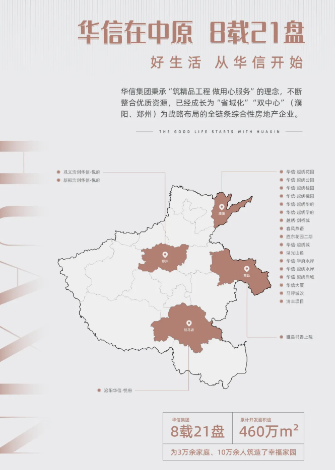 从2013年到2021年,华信集团与濮阳从初次会面到相知相交,始终怀揣一颗热忱之心,将美好人居理念带入城市,为革新城市人居贡献自己的力量。