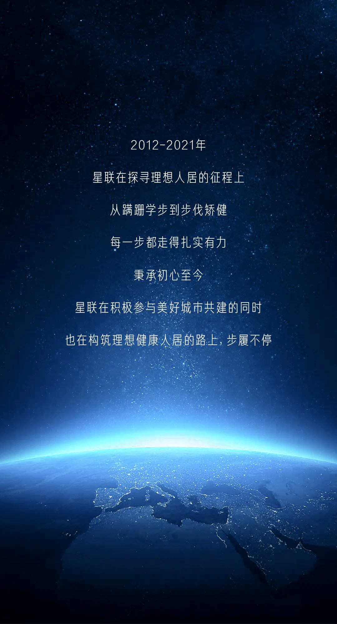 随着全新品牌形象的发布亮相,星联将以焕然一新的欣荣面貌,昂首阔步朝着崭新的方向前行,以更宽广的视野、更远大的格局、更高的发展目标致敬城市化建设,以“让城市更美好,让生活更健康”为企业使命,坚持精品定制路线,践行企业社会责任,致力于成为先进的城市健康生活综合运营商,在城市化发展进程中打造理想人居范本。