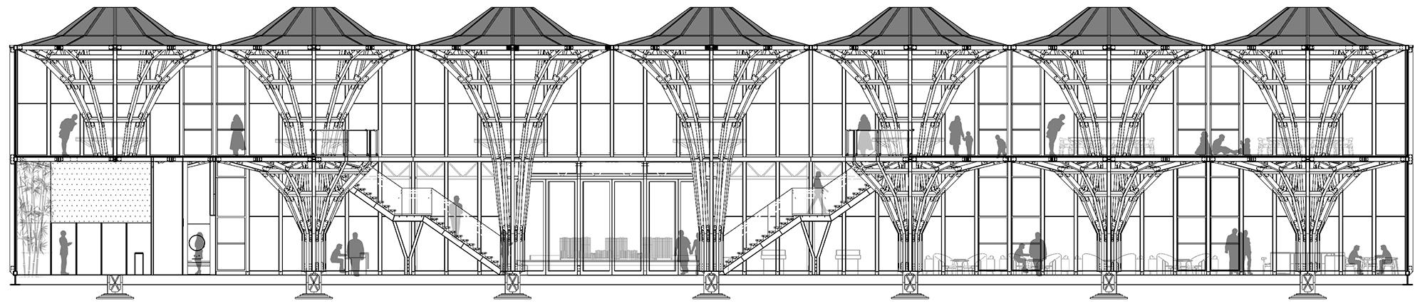 垂直方向采用 “树”的生长形态,分成五段每段2m左右,由内向上也向外慢慢挑出生长,最终形成高度4.5m、边长8m的方体边界空间,这样下部达到了使用的相对较大空间,整体又得相对较大结构强度。