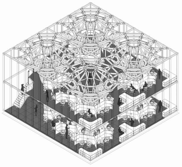 可以采购到高性价比的常规木材尺寸为:3m、4m、6m长,横截面200mm左右的方料。如何运用这些基准木料,去搭建一个大空间,获得更多元的空间适用可能?单根木柱为独立支撑单元是不太合适的,因为得不到一个无柱的大空间状态。