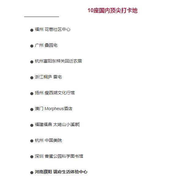 近日,有媒体评选出10座国内的先进打卡点,其中河南濮阳珑府生活体验中心成功入选。