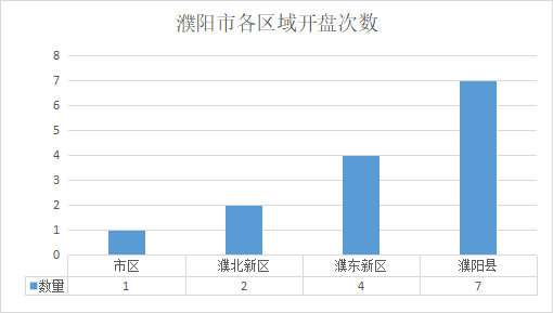 濮阳市各区域中以濮阳县开盘次数最多为7次,占比50%,推出1653套;以市区开盘次数最少为1次,占比7%,推出90套;濮北新区为2次,占比14%,推出460套;濮东新区为4次,占比29%,推出1286套。(此数据仅供参考)