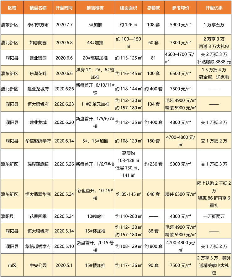 据不完全统计,2020年濮阳第二季度共有14次开盘或者加推,其中有5个新盘首开;其余为老盘加推。此次统计开盘加推时间集中在4—6月期间,推出产品以高层住宅为主。