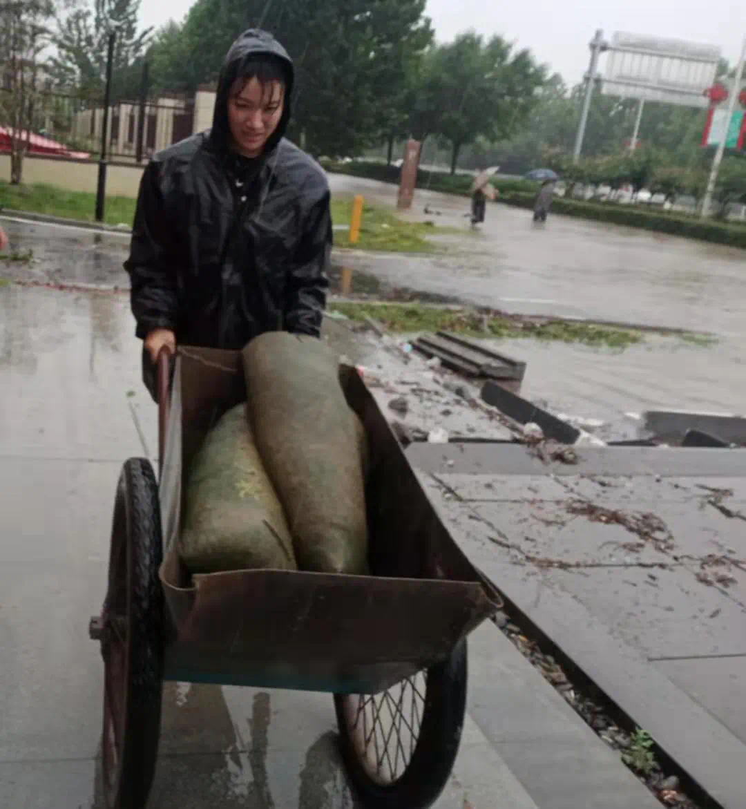 焦作·建业温县春天里小区经理崔婉莹,与小区全体员工暴雨中持续奋战,扛沙袋、堵地库,全力以赴,为业主筑牢安全线。