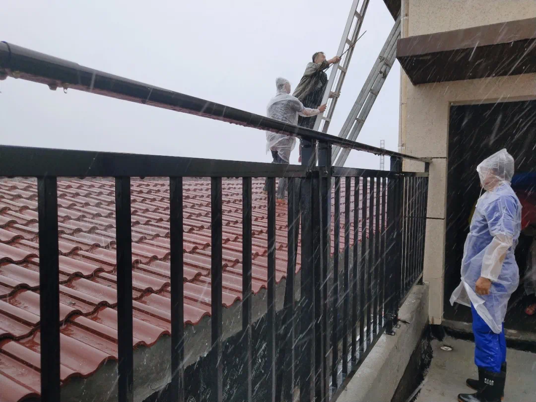 获嘉普罗旺世29号楼屋顶积水严重,如果不及时处理将直接导致房屋漏水。因电梯空间不够,维修工张光世、王义瑞扛着梯子走到了26楼,冒雨处理积水。