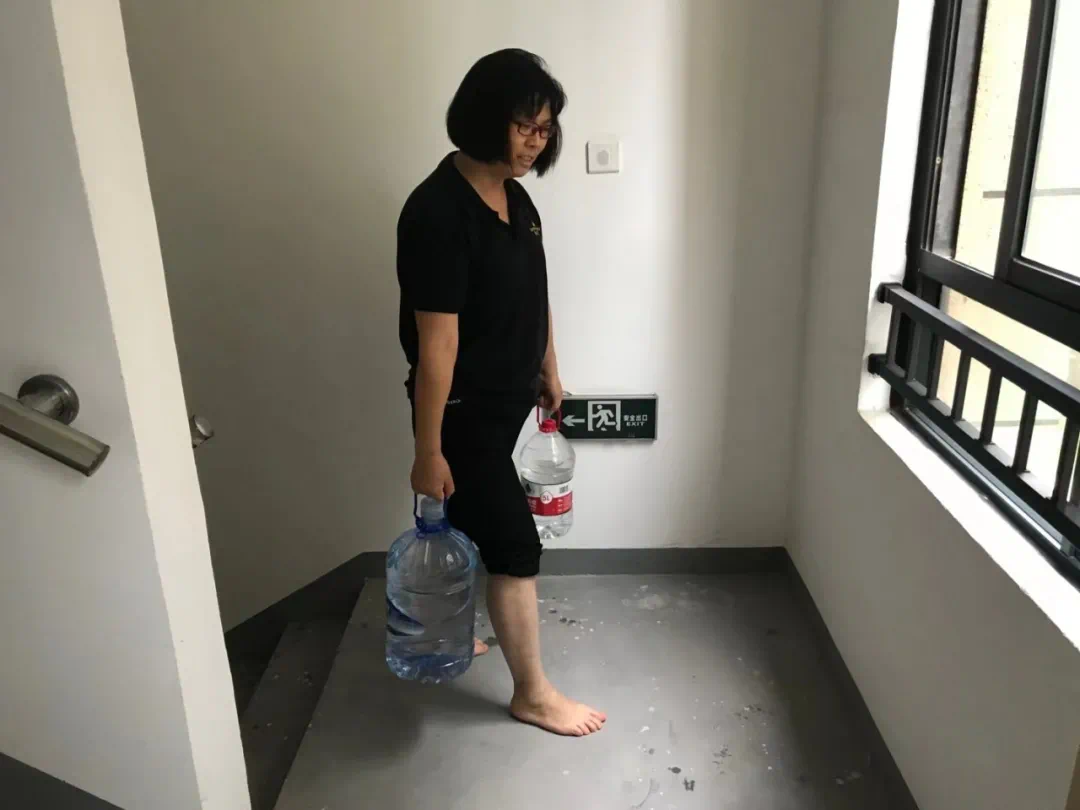 7月22日,暴雨后,新乡城市内涝空前严重,新乡·建业壹号城邦负一层不可避免的出现了部分积水倒灌,但由于进水面积大、水浅,无法使用抽水泵,保洁员匡立梅便一桶一桶地往外运送积水,整整5个小时,几乎没有停歇。