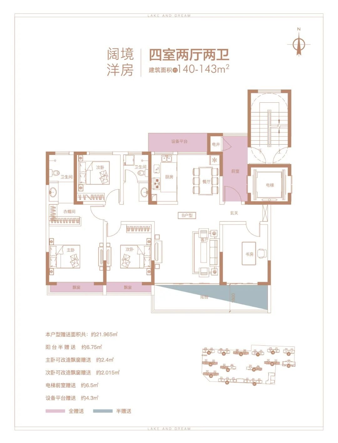 湖光山色匠造建面约140-143㎡阔景四房,额外多享约22㎡使用空间,以理想的空间,应对生活的“多享法”,打造难得的舒适居所。