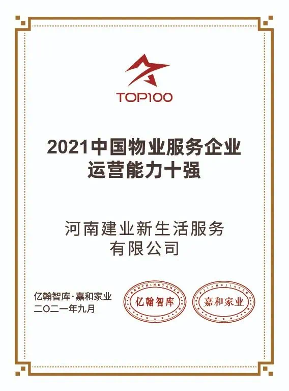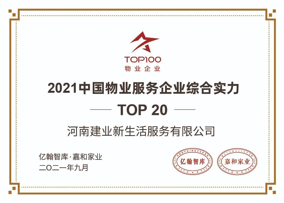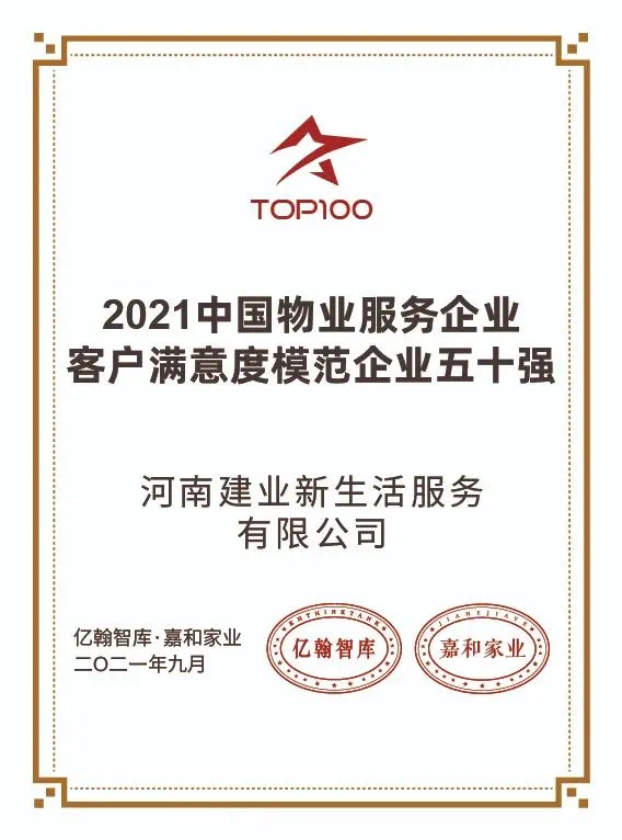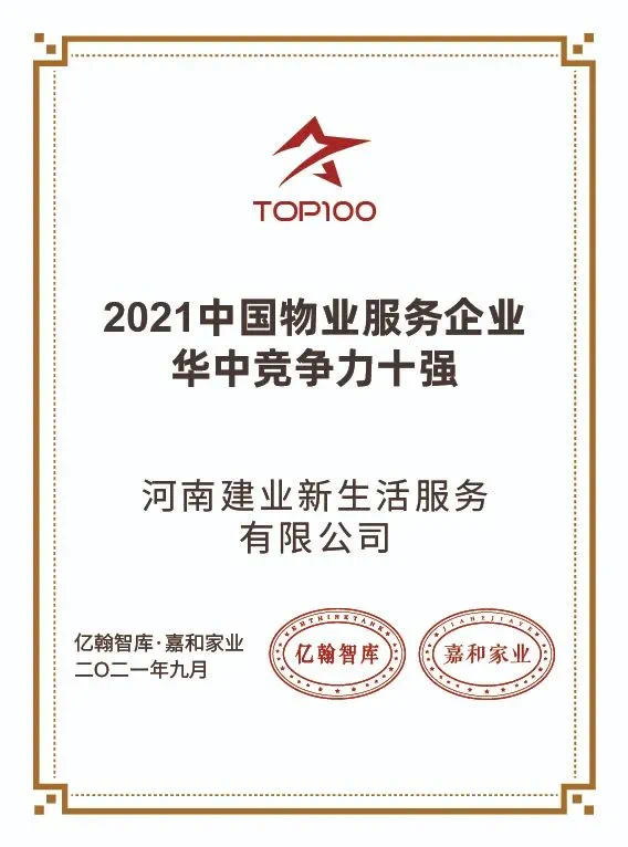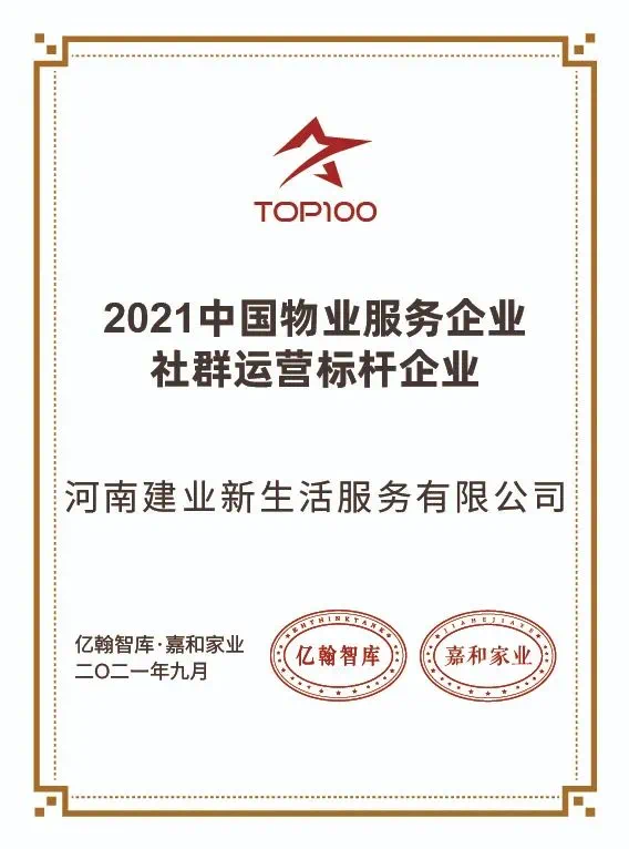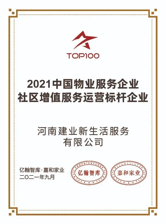 同时,在2021(第四届)乐居财经年度论坛暨财经之夜,建业集团荣获2021年“美好生活贡献企业”;在亿翰智库主办的2021中国房地产业战略峰会上,建业新生活摘得“2021中国物业服务企业华中竞争力十强”“2021中国物业服务企业客户满意度模范企业五十强”“2021中国物业服务企业品牌价值二十强”“2021中国物业服务企业社区增值服务运营标杆企业”“2021中国物业服务企业社群运营标杆企业”“2021中国物业服务企业运营能力十强”“2021中国物业服务企业综合实力TOP20”等七项行业殊荣。