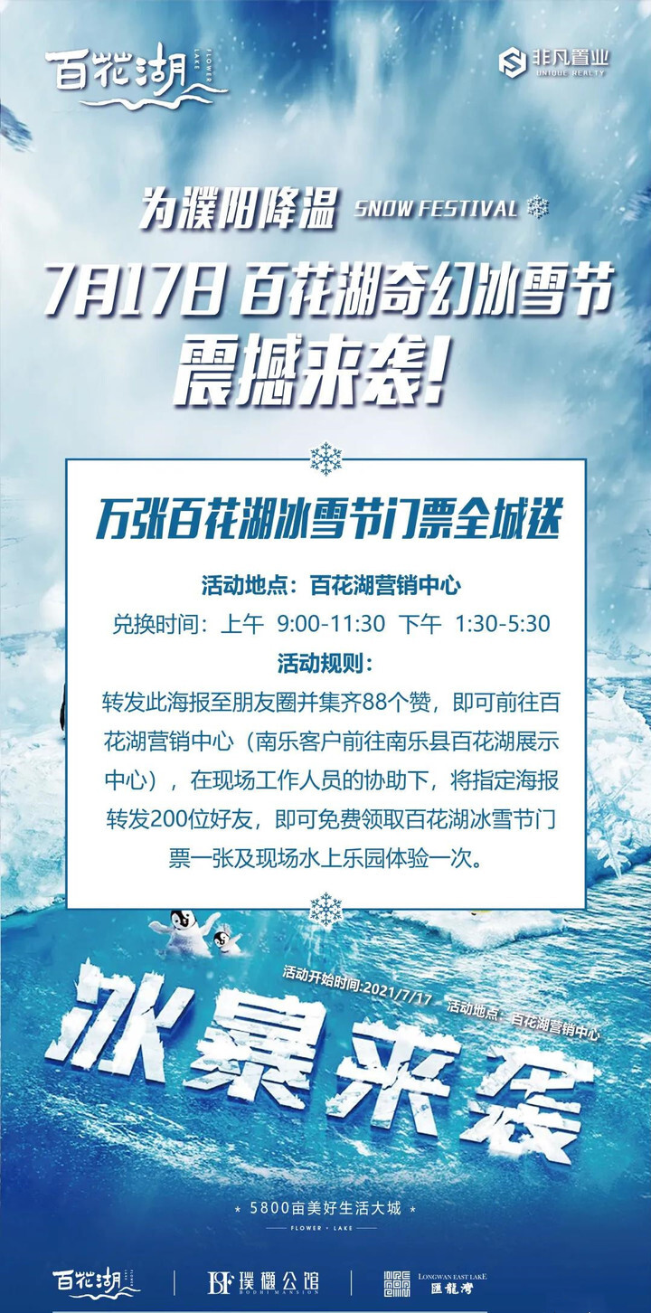 转发上方指定海报至微信朋友圈并集齐88个赞,即可前往百花湖营销中心或南乐县百花湖展示中心 ,在现场工作人员的协助下,将指定海报转发200位好友,即可免费领取百花湖冰雪节票一张及现场水上乐园体验一次。