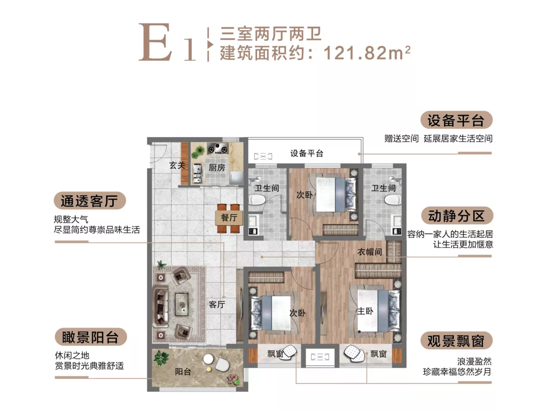 建面约121.82㎡方正E1户型,3房2厅2卫
